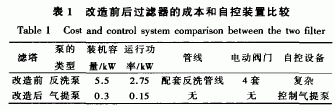 由表1可見,改造后的連續(xù)動態(tài)過濾器與改造前的普通過濾器相比,其裝機(jī)容量大幅降低,折合到24 h進(jìn)行比較,其運行功率減少了50%,反沖洗自控裝置簡化。因此連續(xù)動態(tài)過濾器的設(shè)備成本和運行成本均優(yōu)于普通過濾器,而且操作簡單,運行安全。
