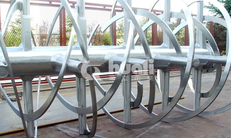 HTM型螺條式混合機(jī)結(jié)構(gòu)如圖所示,它有傳動(dòng)部件、筒體、筒蓋、特殊布置的螺條主軸、出料閥等組成。