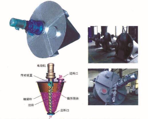 YSH型雙螺旋錐形混合機(jī),它由噴液裝置、傳動(dòng)部分、筒蓋、螺旋、簡(jiǎn)體、出料閥箱等組成。