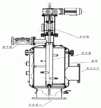 過濾過程:污水從過濾器進(jìn)口進(jìn)入,然后從里向外通過濾網(wǎng),比網(wǎng)孔大的雜質(zhì)被攔截下來并積累在濾網(wǎng)的內(nèi)表面形成濾餅,這些濾餅同時能夠捕捉水中的一些更細(xì)小的雜質(zhì)。自清洗過程:壓差開關(guān)持續(xù)地檢測濾網(wǎng)內(nèi)外的壓差,當(dāng)達(dá)到預(yù)設(shè)值時將傳遞信號到控制箱啟動清洗循環(huán)。過濾器的清洗機(jī)構(gòu)是作螺旋式上下運(yùn)動的吸污器,它是空心結(jié)構(gòu),在它的軸線上按一定距離垂直均勻分布著若干個吸污管。吸污器與一個排污閥相通。在排污閥打開時,過濾器內(nèi)部水壓與外部大氣之間形成的壓差使吸污管產(chǎn)生強(qiáng)勁吸力,水流從濾網(wǎng)外向內(nèi)反向高速流動將雜質(zhì)沖下來進(jìn)入吸污器通過排污閥排出。吸污器由一個連有絲桿裝置的雙向電機(jī)驅(qū)動,按照固定的轉(zhuǎn)速作螺旋式的運(yùn)動,這樣多個吸嘴就能吸遍整個濾網(wǎng)內(nèi)表面,這個過程大約需要半分鐘。在整個反清洗過程中,系統(tǒng)不斷流。過濾器的整個運(yùn)行由程序控制器(PLC)來控制完成。圖1 為北京化工大學(xué)與唐山陸凱科技有限公司共同研制的吸污式自清洗過濾器結(jié)構(gòu)示意圖。