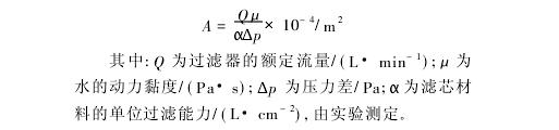 過濾器的工作能力取決于濾芯的有效過濾面積、濾芯本身的性能、水的粘度、過濾器壓差及水中固體顆粒的含量。過濾器進出口壓差越大,阻力越小時,過濾器的過濾能力越大。水流通過濾芯的速度越低,表面壓力越小,則過濾精度越高。過濾器的設計主要根據(jù)工作壓力和過濾精度的要求選擇濾芯材料,按所要求的流量及選擇的濾芯材料來計算過濾面積。過濾器的有效過濾面積[4]